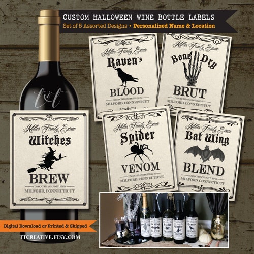 Printable Halloween Wine Labels, Vintage Halloween Labels, Halloween Party Decor, Halloween Gift, Apothecary, Custom Wine Labels, Set of 5